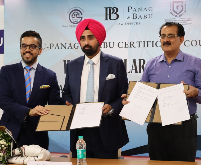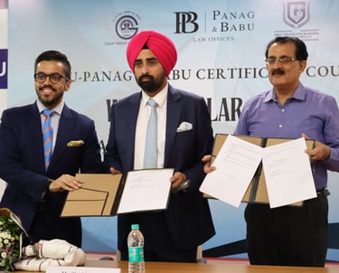 The course concluded with a valedictory ceremony graced by distinguished guests including Mr. Satya Ranjan Mishra; Dr NITIN MALIK, Registrar, GNLU; and Prof. (Dr.) Girish R., Head of Academic Affairs, GNLU. A significant highlight of the ceremony was the signing of a Memorandum of Understanding (MoU) between the Law Offices of Panag & Babu and GNLU. The MoU formalizes their collaboration, ensuring the continuation of this specialized course for the next three years and reinforcing their joint commitment to excellence in legal education.