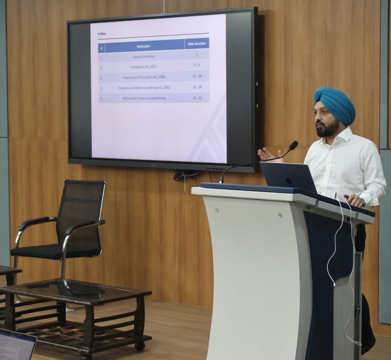 𝐒𝐞𝐬𝐬𝐢𝐨𝐧 5: Specific Statutes dealing with White-Collar Crimes – Mr. Bhullar examined the provisions of the Companies Act, 2013, focusing on the wide ambit of fraud under Section 447, auditors’ obligations under Section 143(12), and directors’ duties of disclosure. He also discussed the Prevention of Corruption Act, 1988, highlighting the 2018 amendment that brought both bribe-givers and bribe-takers within its scope, India’s absolute prohibition on facilitation payments, and the growing need for compliance-driven business practices.