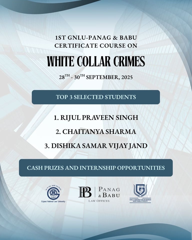 We are pleased to announce the top three students of the 1st GNLU – Panag & Babu Certificate Course on White Collar Crimes (2025). This year’s cohort included over 75 students from 23+ universities across India, selected from more than 125 applications.