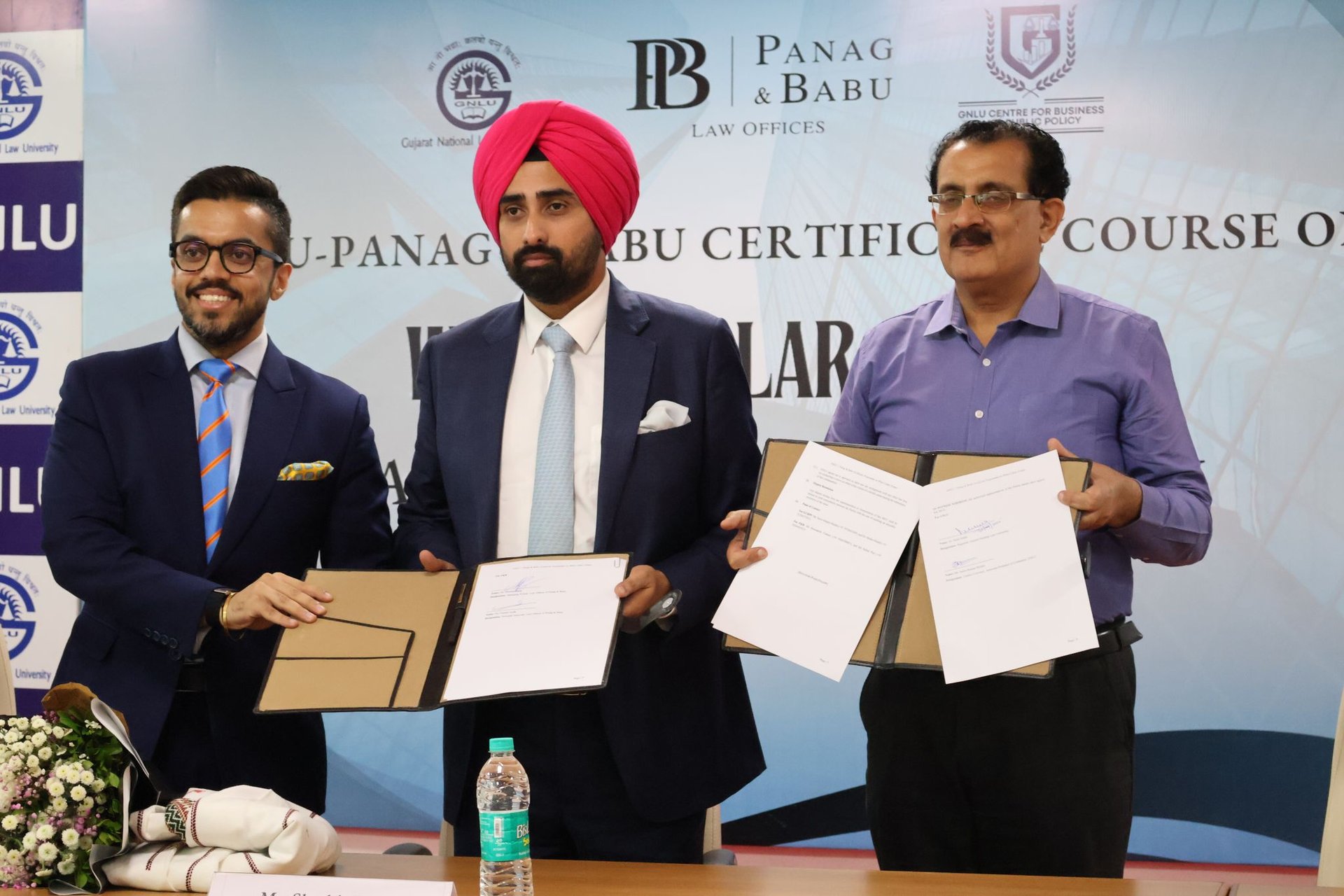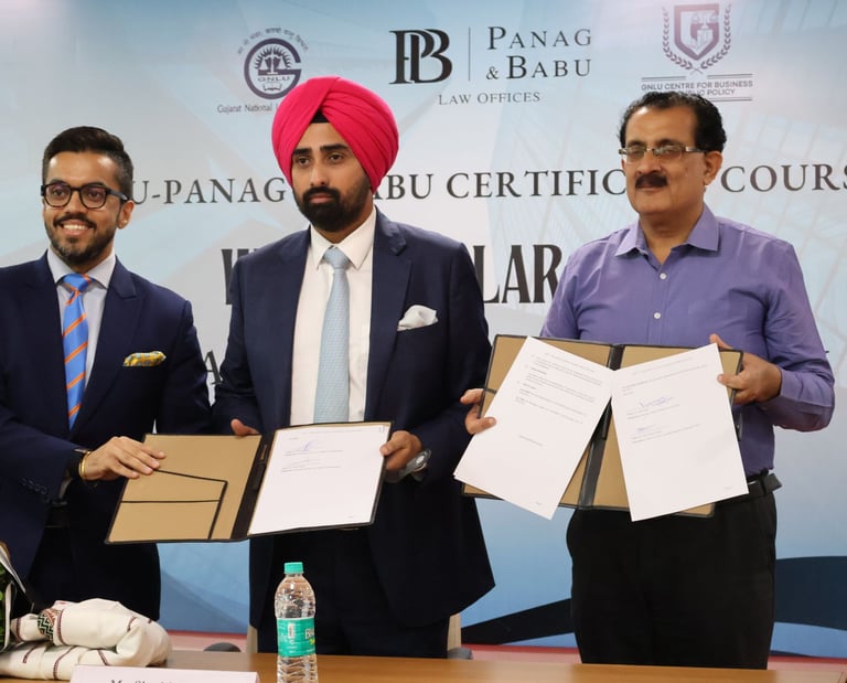 The course concluded with a valedictory ceremony graced by distinguished guests including Mr. Satya Ranjan Mishra; Dr NITIN MALIK, Registrar, GNLU; and Prof. (Dr.) Girish R., Head of Academic Affairs, GNLU. A significant highlight of the ceremony was the signing of a Memorandum of Understanding (MoU) between the Law Offices of Panag & Babu and GNLU. The MoU formalizes their collaboration, ensuring the continuation of this specialized course for the next three years and reinforcing their joint commitment to excellence in legal education.