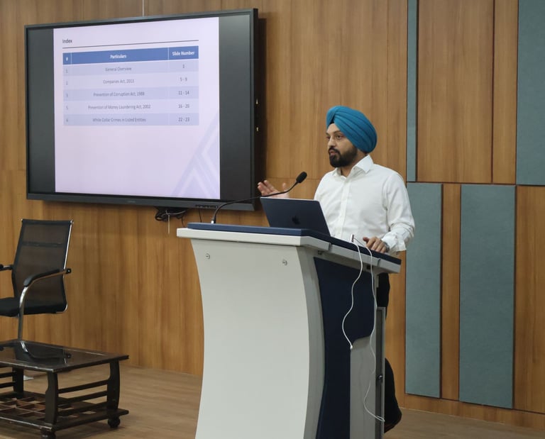 𝐒𝐞𝐬𝐬𝐢𝐨𝐧 5: Specific Statutes dealing with White-Collar Crimes – Mr. Bhullar examined the provisions of the Companies Act, 2013, focusing on the wide ambit of fraud under Section 447, auditors’ obligations under Section 143(12), and directors’ duties of disclosure. He also discussed the Prevention of Corruption Act, 1988, highlighting the 2018 amendment that brought both bribe-givers and bribe-takers within its scope, India’s absolute prohibition on facilitation payments, and the growing need for compliance-driven business practices.